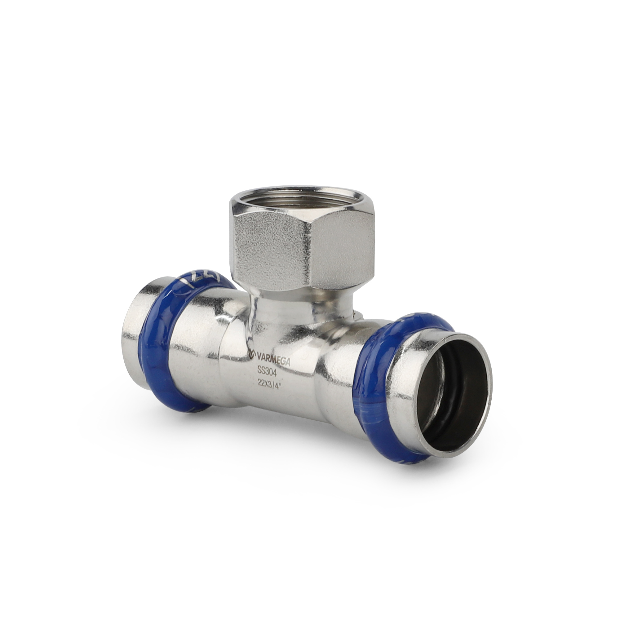 Тройник с внутренней резьбой Varmega Inox Press с двух сторон имеет раструбное соединение для труб, а с третьей стороны фитинга находится внутреннее резьбовое соединение. Данный фитинг позволяет присоединить к трубопроводу различные резьбовые элементы (краны, фильтры и т. п.), также дает возможность подключиться к другому типу трубопровода. Для получения надежного неразъемного соединения трубы и фитинга потребуется специальный пресс-инструмент с насадками типа профиль «V».
