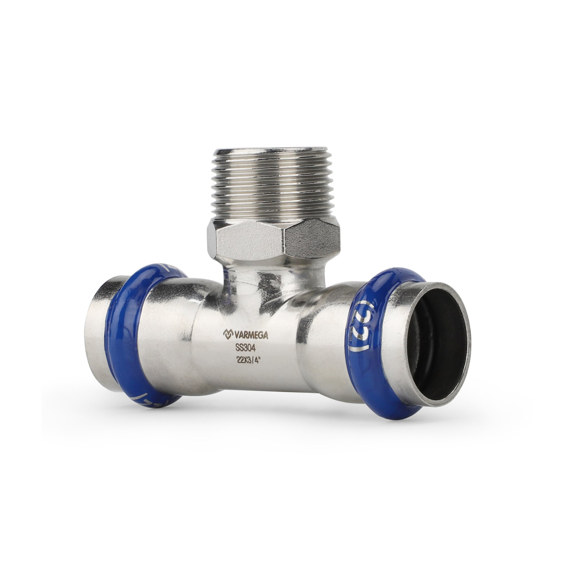 Тройник с наружной резьбой Varmega Inox Press с двух сторон имеет раструбное соединение для труб, а с другой стороны фитинга находится наружное резьбовое соединение. Данный фитинг позволяет присоединить к трубопроводу различные резьбовые элементы (краны, фильтры и т. п.), также дает возможность подключиться к другому типу трубопровода. Для получения надежного неразъемного соединения трубы и фитинга потребуется специальный пресс-инструмент с насадками типа профиль «V».